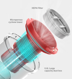 Thiết kế bộ lọc HEPA cùng phương pháp lọc lốc xoáy bên trong với lực ly tâm lớn dễ dàng tách bụi ra khỏi không khí. Bụi lúc này được khóa trong cốc đựng bụi với dung tích 0.6L, trả lại không khí trong lành và sạch sẽ. Bộ lọc này có khả năng lọc các hạt bụi siêu nhỏ không thể thấy bằng mắt thường, giúp cho môi trường sống của bạn trong lành hơn.