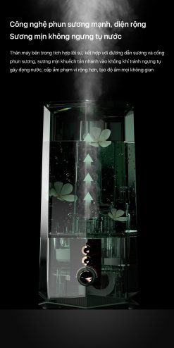 Công nghệ phun sương mạnh, diện rộng. Sương mịn không ngưng tụ nước. Thân máy bên trong tích hợp lỗi sứ, kết hợp với đường dẫn sương và cổng phun sương, sương mịn khuếch tán nhanh vào không khí tránh ngưng tụ ngay động nước, cấp ẩm phạm vi rộng hơn, tạo ẩm mọi không gian.