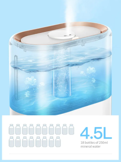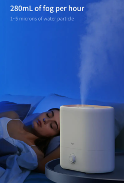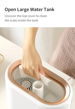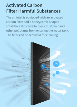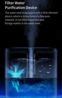 Có thể thêm nước từ phía trên. Dễ dàng vệ sinh bình chứa. Bộ lọc nước than hoạt tính. Dung tích bình chứa lớn, có thể hoạt động liên tục trong 12 tiếng. Điều chỉnh hướng phun sương 360 độ. Điều chỉnh mức độ phun sương với núm xoay 3 cấp độ. Màu sắc trang nhã, lịch sự.